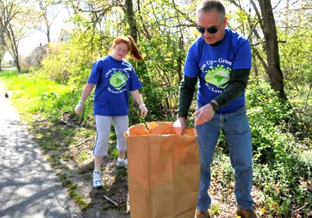 Becky Rutkiewicz helps her father, Bob, also a Commission member, pick up trash near the high tension power lines that cross Seymour St. |